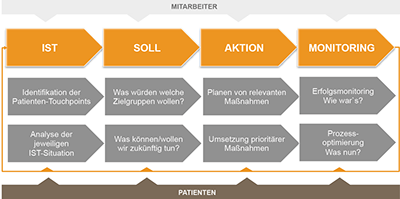dem Monitoring, folgt dann das touchpointspezifische Messen der Ergebnisse. Darauf aufbauend werden die patientenrelevanten Prozesse weiter optimiert.